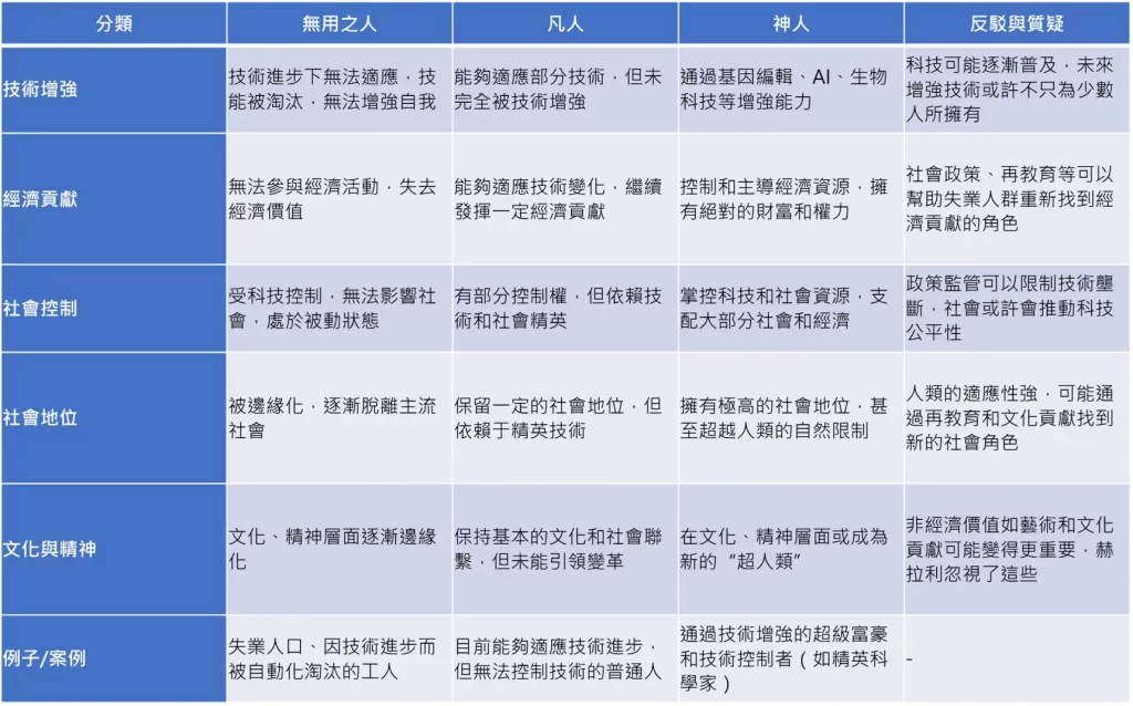 關於《人類大命運》中尤瓦爾·赫拉利所提出的“無用之人”、“凡人”和“神人”分類的表格,展示了它們在不同角度上的差異,並附上了分析與反駁的觀點: